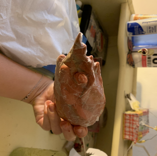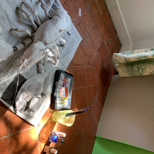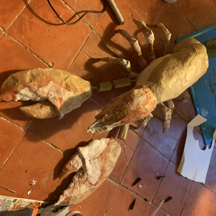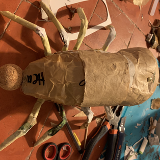 To put it together I covered the top of the body and the tail with craft tape to hold them together. I attached the legs, gave up quickly on them moving with springs, so used a lot of hot glue. I attached the handle with hot glue and the head could just fit in with the ball joint mechanism. To make sure the places where I had used hot glue were paintable, I covered them using tissue and PVA glue. The pincers, I attached them using string, and putting the little tubes I had made to create the arms. I had a go at balancing the two claws, but decided to paint the lobster first.